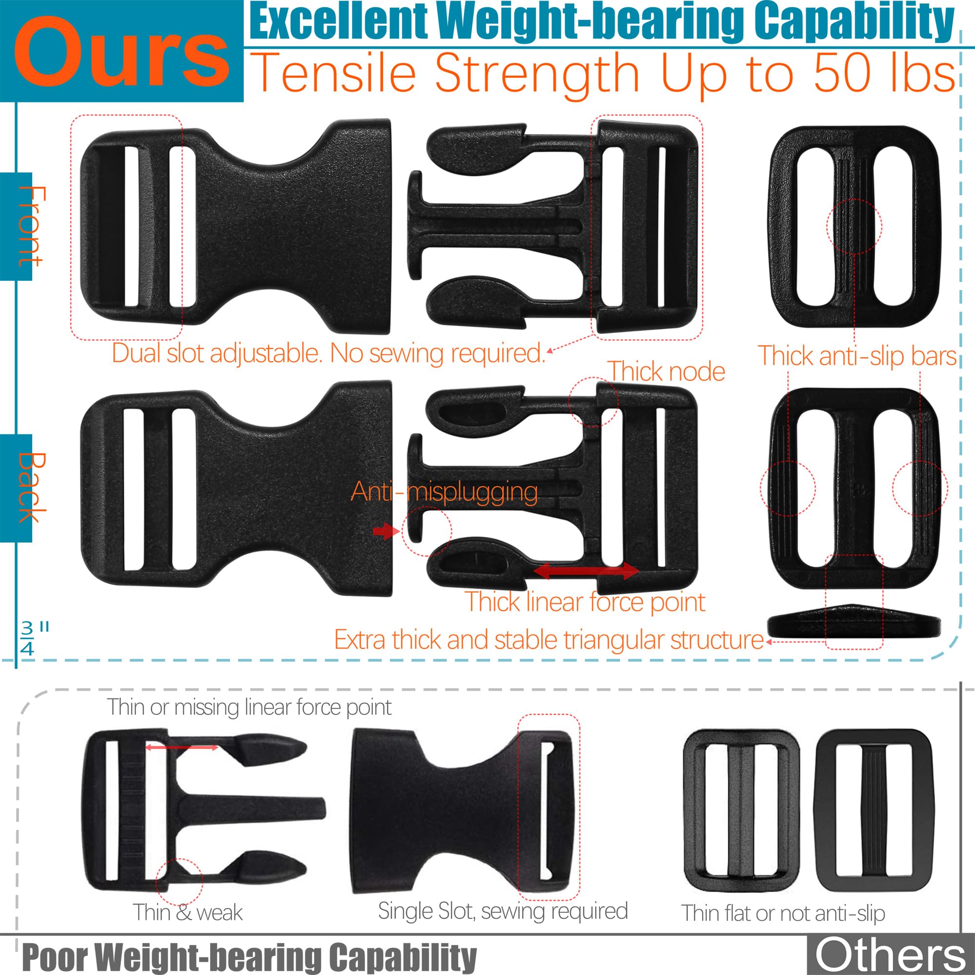 5-Size Webbing Adjuster Set (4 Pack): Slider Buckles and Tri-Glide Slides for Three-Fourths" to 2" Straps